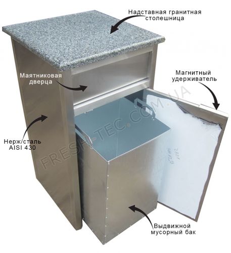 В верхней ее части есть небольшая маятниковая дверца. В нижней части расположен мусорный бак с удобными ручками, который плотно закрывается дверцей с магнитным удерживателем. Внутрь бака помещается пакет для мусора, который по мере заполнения легко заменяется.